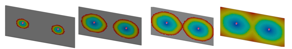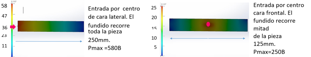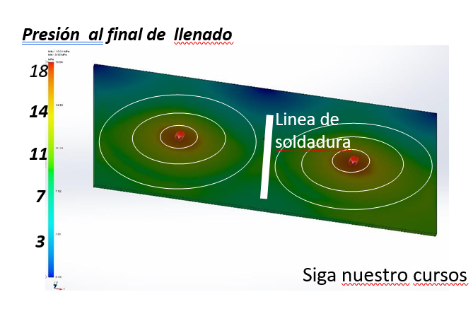 Se observa que el nivel de presión se reduce; sin embargo, en el centro de la pieza colisionan dos frentes de flujo, dando lugar a esta línea. Si el material es coloreado, este defecto se hace más evidente.